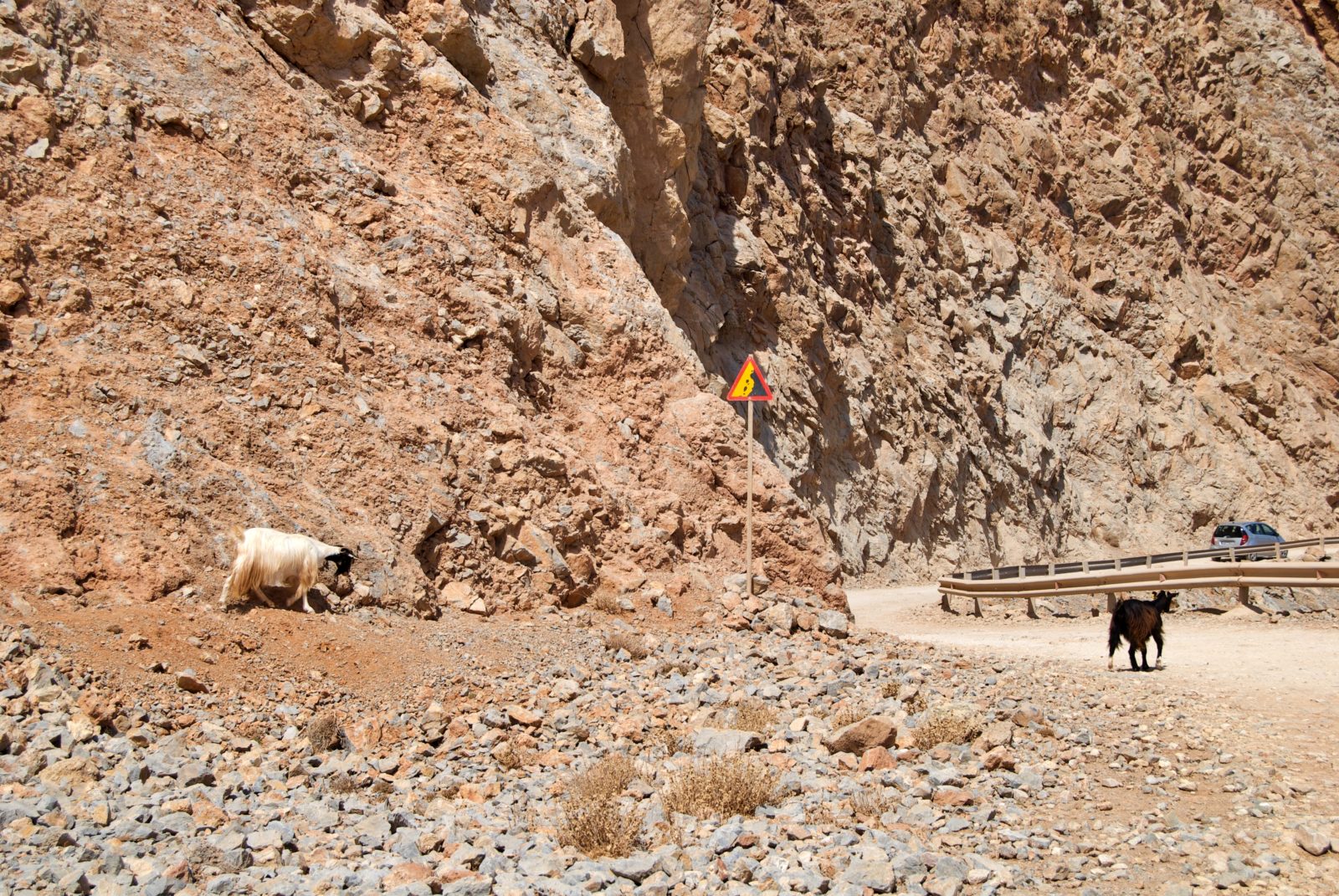 Trasa, początkowo normalna, na ostatnich 7 km zmienia się w żwirową ścieżkę. Jest przejezdna dla samochodów, jednak tempo przemieszczania się jest powolne. Dodatkowo trzeba uważać na wolno biegające po drodze kozy 🙂 Docieramy do niewielkiego parkingu, skąd czeka nas już spacer w dół. Ruszamy.