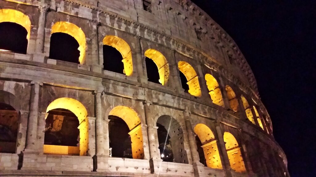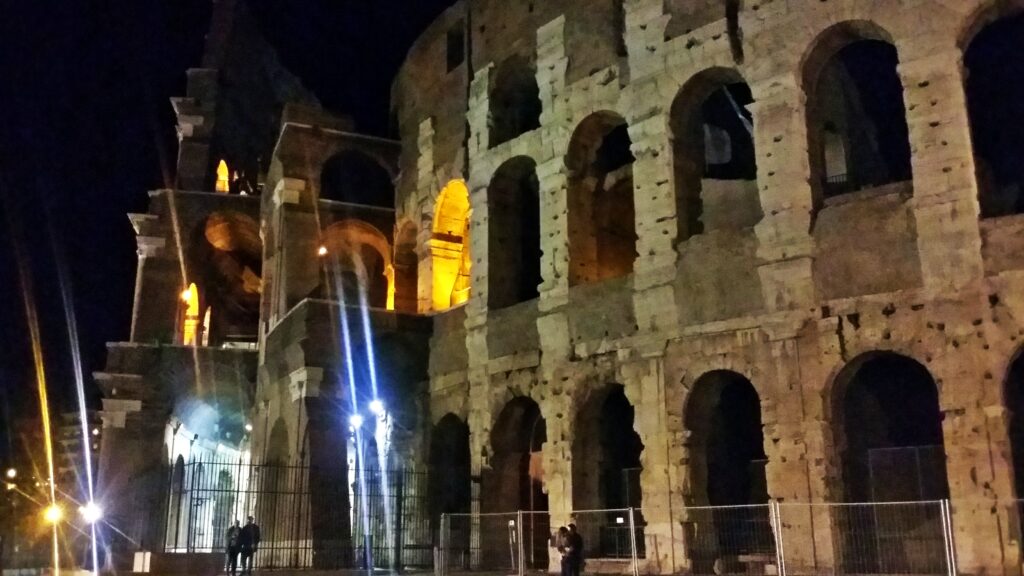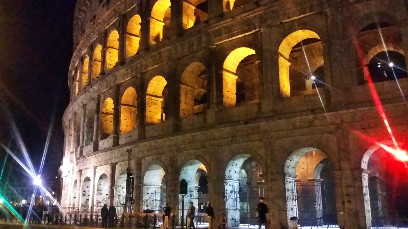 Droga do Rzymu dłużyła się niemiłosiernie. Wiedzieliśmy, że dotrzemy tam wieczorową porą, czyli plan zwiedzania Rzymu bierze w łeb. W końcu dojechaliśmy. Odebraliśmy klucze do ślicznego mieszkanka, wypiliśmy szybką kawę i… zaczęło się ściemniać. No nic, stwierdziliśmy, że ruszamy w kierunku Koloseum. Podświetlone, nocą, musi wyglądać imponująco. I nie zawiedliśmy się. Blask latarni odbijających się w kamiennych murach naprawdę robi wrażenie i dodaje samej budowli majestatyczności. Przepraszam za jakość zdjęć, ale mój ukochany aparat wyzionął ducha w Watykanie 🙁 i podczas dalszej podróży ratowaliśmy się już tabletem i starym telefonem…