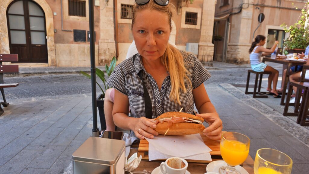 Na Sycylii nie można rozpocząć dnia bez cappuccino. Udaliśmy się w tym celu do pobliskiej kawiarenki. Jako, że facet głodny, to facet zły, postanowiłam nakarmić odpowiednio Michała przed zwiedzaniem. Nie zdziwiło nas, że byliśmy w kawiarni jedynymi, którzy na śniadanie zamiast croissanta wcinali panini. No cóż, ja nie jestem fanką śniadania na słodko, a Michał to już w ogóle…