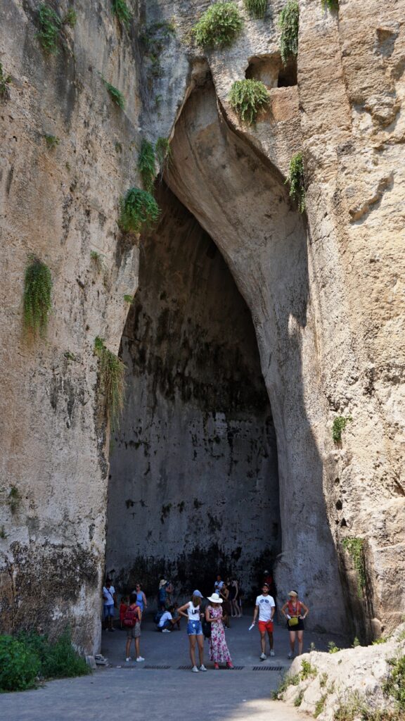 Ucho Dionizosa – grota długa na 65 metrów, słynąca z niebywałej akustyki. Ponoć, dzięki wspomnianej akustyce, władca Syrakuz Dionizjos Starszy miał możliwość podsłuchiwania rozmów więźniów trzymanych w jaskini. Nazwę wymyślił w roku 1586 Caravaggio – tak, dokładnie ten sam Caravaggio, którego obrazy można podziwiać w Konkatedrze Św. Jana w Valletcie, na Malcie. Słynny malarz również część życia spędził w Syrakuzach. W kościele Chiesa di Santa Lucia Alla Badia, tuż przy Piazza del Duomo w Syrakuzach, znajduje się jego obraz: Pochówek św. Łucji.