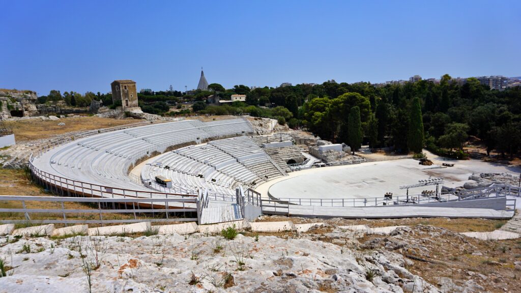 Teatr grecki pochodzi z V wieku p.n.e. i jest jednym z największych tego typu obiektów w Europie. Widownia aktualnie może pomieścić 15 tyś. widzów, a dawniej była jeszcze większa. Niestety, została częściowo rozebrana, a kamienie wykorzystano do budowy murów obronnych Ortigii. Miało to miejsce w XVI wieku.