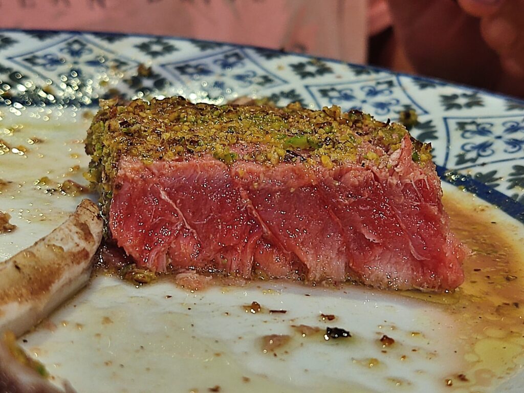 Byliśmy głodni jak wilki. W końcu wyruszyliśmy z Malty ciemną nocą, prom mieliśmy o świcie, a prosto z promu pojechaliśmy odwiedzić Pentalica… Kto jeszcze nie czytał o tej nekropolii, to zapraszam: Terenówką po Sycylii – cz. 1: Necropolis of Pantalica. No, ale wracając do jedzonka. Przysiedliśmy w jednej z okolicznych restauracji: A Putia i wystawiliśmy nasze podniebienia na sycylijską ucztę. Porcje bardzo godziwe. Zamówiliśmy talerz przystawek, który ostatecznie okazał się trzema oddzielnymi talerzami, na których zagościły: sery i mięsa, warzywa oraz ryby i owoce morza. Danie główne, czyli dla mnie tuńczyk z pistacjami, a dla Michała baranina – rozpływało się w ustach. No dobra, ja bym trochę bardziej podpiekła tego tuńczyka, ale Michał wyśpiewywał peany na jego cześć. Zdecydowanie warto polecić to miejsce. Ceny też bardzo dobre. Najdroższa była baranina i kosztowała 14 Euro.
